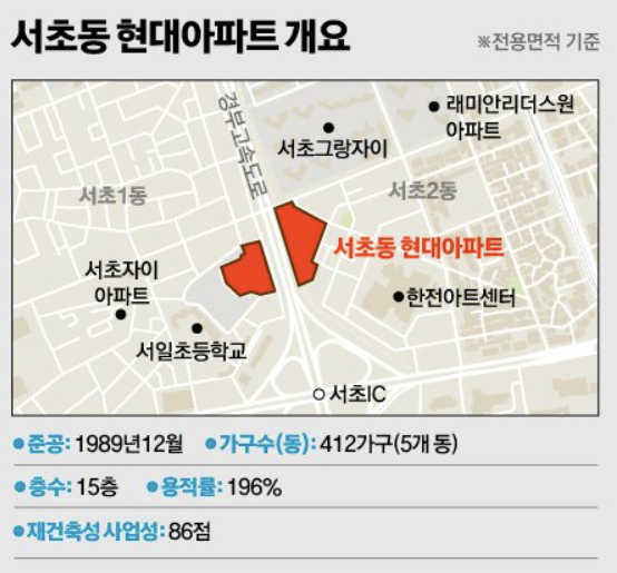 1989년 준공한 서초현대는 단지 사이를 경부간선도로가 가로지릅니다. 부산방향으로 왼쪽에는 10, 11, 12동 160가구, 오른쪽에는 20, 21동 252 가구가 들어서 있습니다.