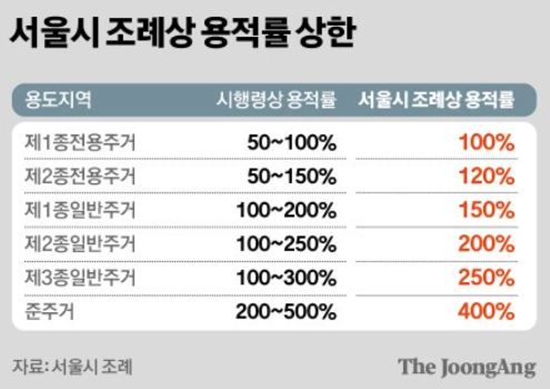 재건축에서 용적률은 곧 돈입니다. 노후 아파트를 철거하고 새 아파트를 짓는 사업이다 보니 설계비, 공사비등 막대한 비용이 필요합니다 그래서 기존 가구 수보다 새집을 더 짓고 일반 분양으로 판매해 공사비 등을 충당하는 구조입니다. 새집을 조합원들이 원하는 만큼 지을 수는 없습니다. 용도지역에 따른 용적률 상한 까지만 가능합니다.