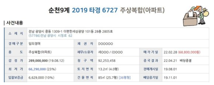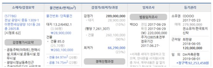 전남 광양시에 있는 아파트입니다. 2억 8000만 원짜리가 6800만 원까지 떨어진 사례입니다. 권리분석을 해 보면 근저당밖에 없습니다. 근저당은 앞서 살펴봤듯 말소되는 권리입니다.