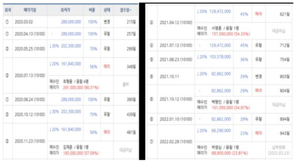 이걸 간과하고 처음에 3명이 낙찰을 받으려 했습니다. 전세금이 2억 2000만 원인데 이 전세권은 낙찰자가 다 인수해야 한합니다. 1억 6500만 원에 낙찰을 받아도 결국 3억 8599만 원이 들어가는 경우입니다. 감정가(2억 8900만 원) 보다 비싸졌습니다. 결국 대항력 있는 임차인의 전세금을 고려해 최종 6889만 원에 낙찰된 사례입니다.