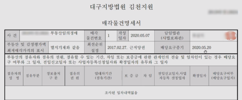 조사관이 직접 현장에서 파악한 현황조사내역 및 매각물건명세서를 확인합니다. 또한 관리사무소를 방문하여 미납관리비 여부도 파악해야 합니다.