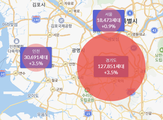호갱 노노에서 확인 해 본 공급량 그래프를 보면 경기도 및 인천 모두 3.5% 공급량이 많은 상태이고 서울은 0.9% 공급량이 많은 상태입니다.
