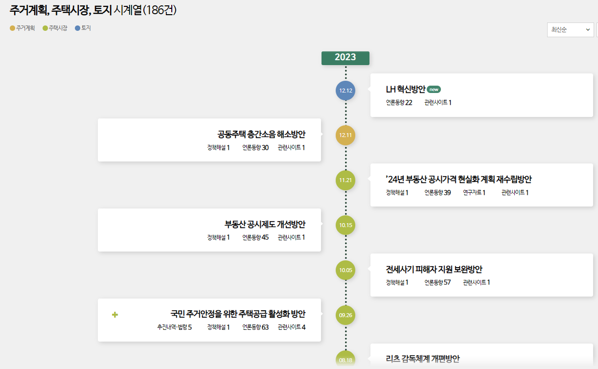 'KDI 경제정책 시계열 서비스'를 검색해서 주제별 보기에서 부동산 > 주택시장을 선택하면 부동산 정책을 한눈에 정리된 화면으로 볼 수 있습니다.