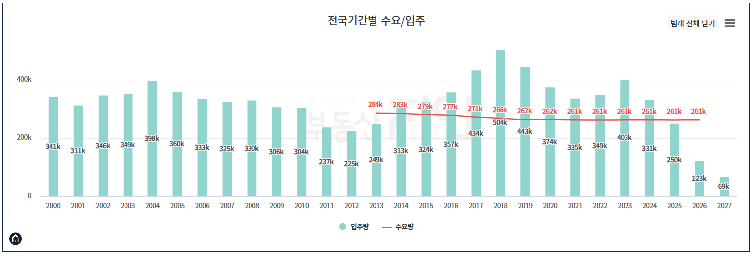 수요량 대비 입주량이 많은 곳이 공급이 많은 지역 입니다. 아파트 지인에서 지역별로 확인할 수 있습니다. 현재 그래프는 전국 아파트 공급량으로 그래프를 보면 2024년까지 전국 아파트 공급량은 과잉 상태입니다.