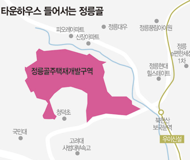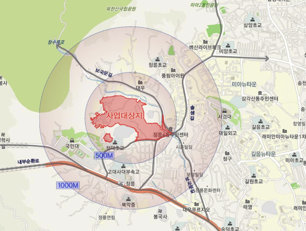 정릉동 정릉골은 1960~1970년대 철거민들의 이주로 시작된 독특한 주거 단지입니다. 북한산 자락에 있어 서울시의 자연경관으로 지정되어 있어, 고층단지가 아닌 4층 타운하우스로 새롭게 거듭납니다. 북한산 국립공원과 정릉천 등과 가까워 친환경 주거를 원하는 수요자에게 안성맞춤입니다.