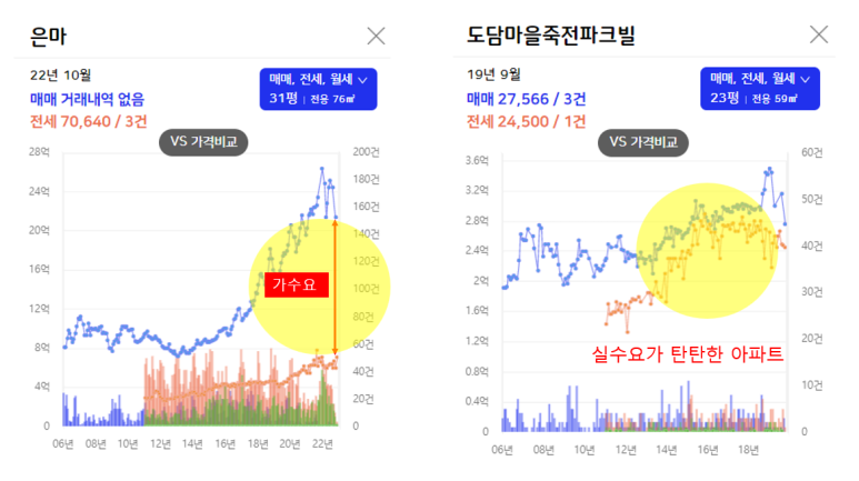 전세가는 실제 사람들이 거주하는 데 지불할 수 있는 가격임에 반해 가수요는 기대 심리적인 부분입니다. 가수요는 교통 호재, 리모델링 및 재건축 등의 기대심리로 생겨나는 수요입니다. 가수요는 심리적인 가치이기 때문에 쉽게 빠질수 있어, 가수요가 빠지게 되면 매매가가 크게 하락할 수 있습니다.