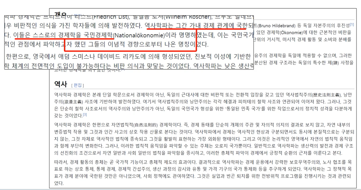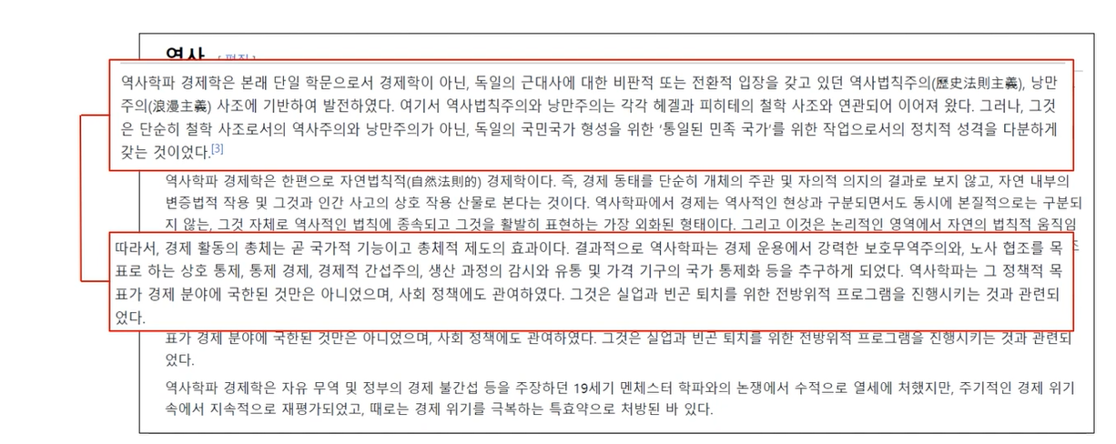 "역사학파는 그간 가내 경제 관계에 국한"과 "이들은 스스로의 경제학을 국민경제학"과 바꾸어 봅니다. 문장 순서를 바꾸면 말은 맞지 않습니다. 하지만 로봇은 내용이 맞는지 아닌지를 판단하는 것이 아닙니다. 내용이 주제와 관련되어 있는지 확인하기 때문에 승인받는 데 적합한 글이 됩니다.