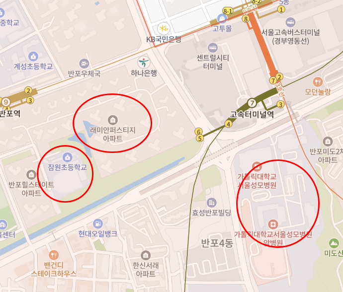 고속터미널역 인근 강남성모병원 맞은편에는 반포 래미안퍼스티지가 있고 단지 바로 옆에 잠원초등학교가 있습니다.