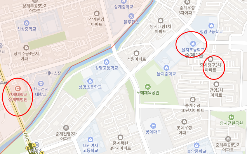 서울 3대 학군 중 하나인 중계동에 위치한 상계백병원입니다. 을지초등학교는 강북 최고 학군지로서 1학년대비 6학년 학생수가 두 배가까이 차이 납니다.