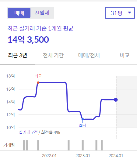 동자초등학교 바로 앞 우성아파트 3차는 31평 거래가 14억 초반대에 거래되었습니다.