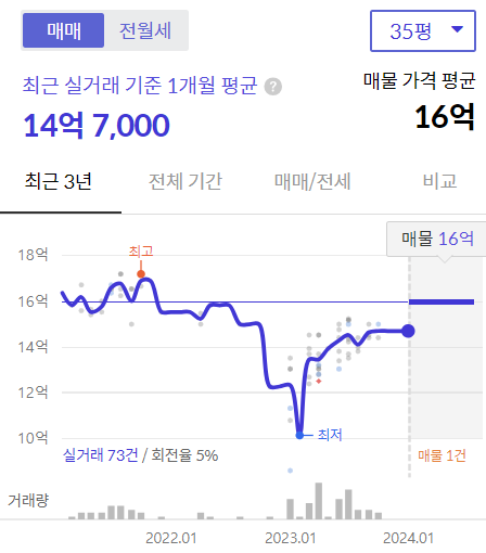 고덕래미안힐스테이트 최근 실거래가는 14억대입니다. 2023년 초 크게 빠졌던 가격이 반등한 상태입니다.