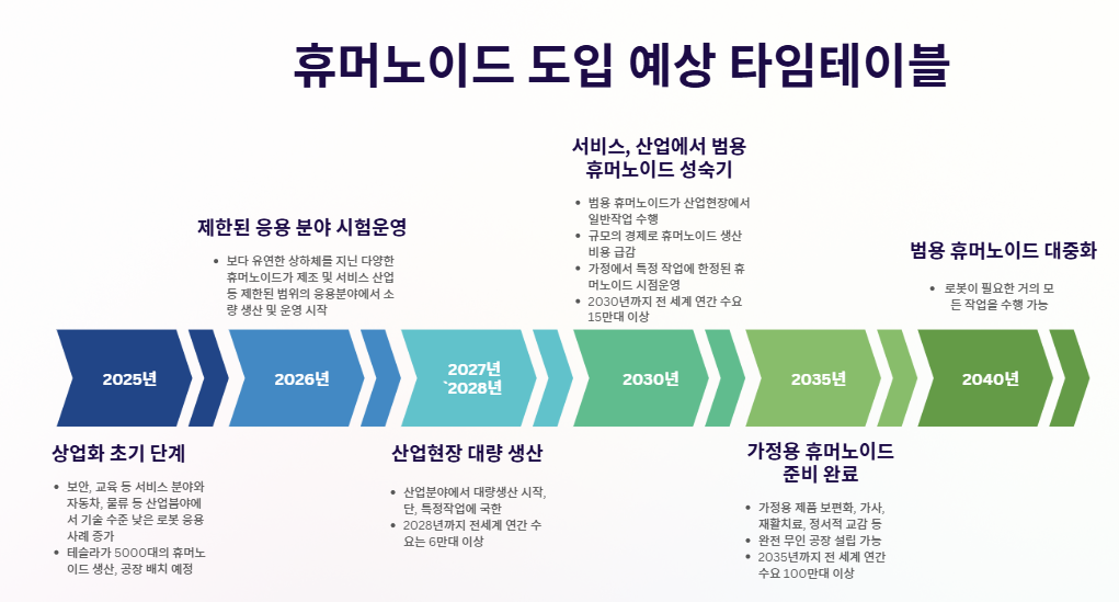 2030년이면 산업 현장에서 로봇이 일하는 게 당연해지고, 2035년이면 가정에서도 로봇을 볼 수 있다는 전망이에요. 마치 전기차가 어느 순간 대중화된 것처럼, 휴머노이드도 '전기차의 순간'을 맞이할 거란 분석이죠.